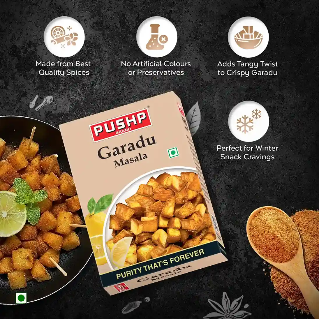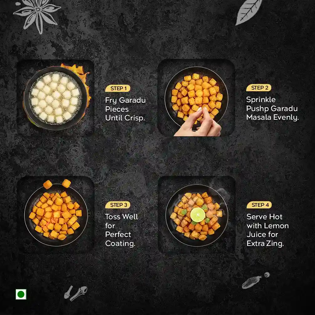 Pushp Garadu Masala is an authentic Rajasthani-style spice blend specially crafted for making crispy, tangy garadu (yam) fries. This medium-spice masala delivers the perfect coating that transforms simple yam pieces into irresistibly spicy, golden street food favorites.