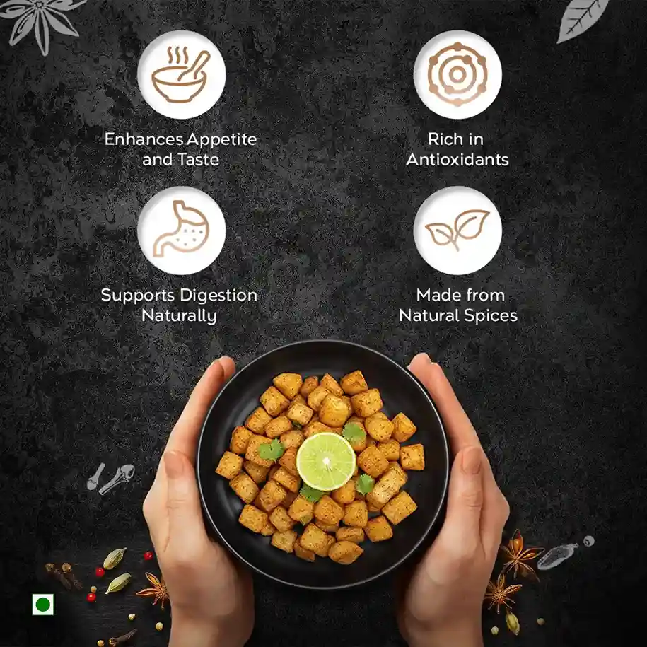 - Made with salt, coriander, dry mango, chilli, cumin, black pepper, cinnamon, clove, cassia, dry ginger, mace, black salt, nutmeg, cardamom, turmeric, caraway, and asafoetida.