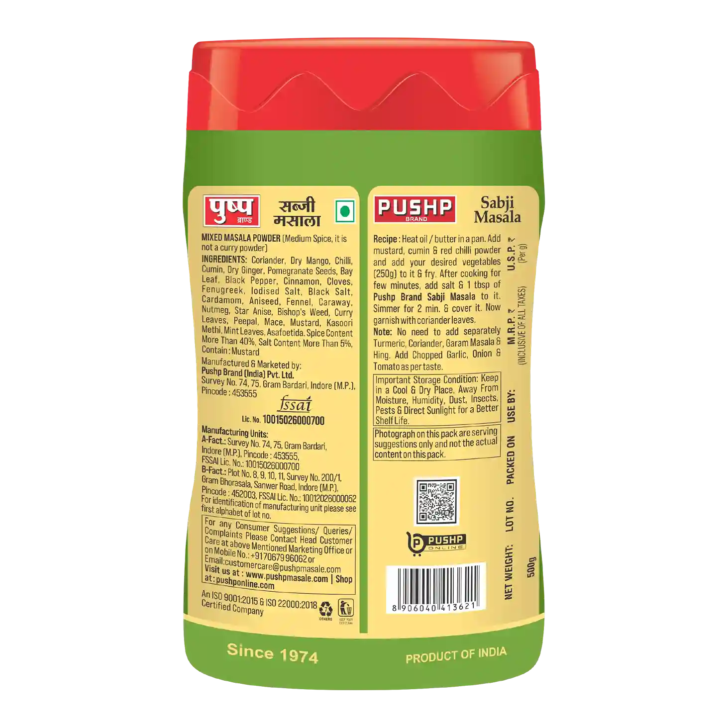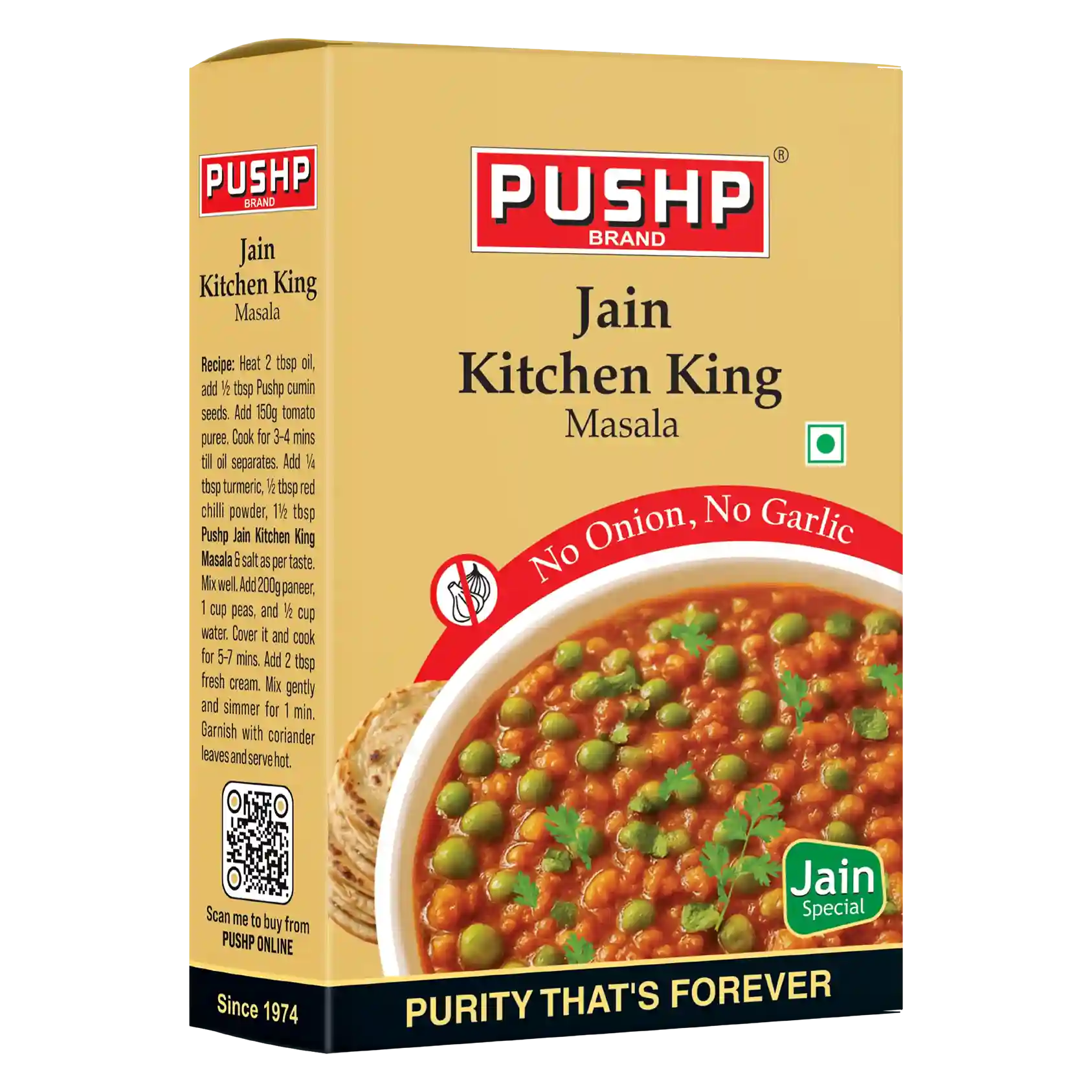 Pushp Jain Masala Combo – Pure, Jain-friendly masalas for satvik cooking—Pushp Jain Kitchen King Masala + Pushp Sabji Masala, both 100% No Onion, No Garlic, trusted by families since 1974.