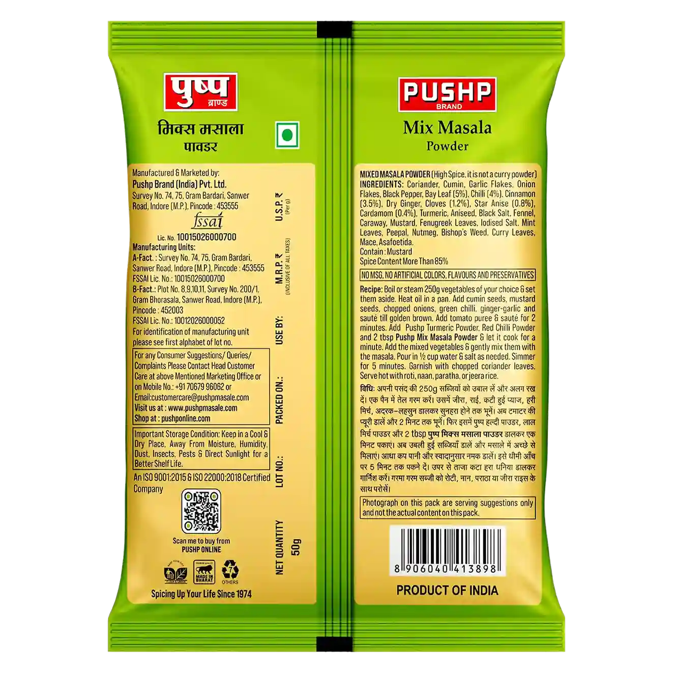 Hygienically packed by Pushp Brand (India) Pvt. Ltd. in ISO 9001:2015 & ISO 22000:2018 certified facilities.